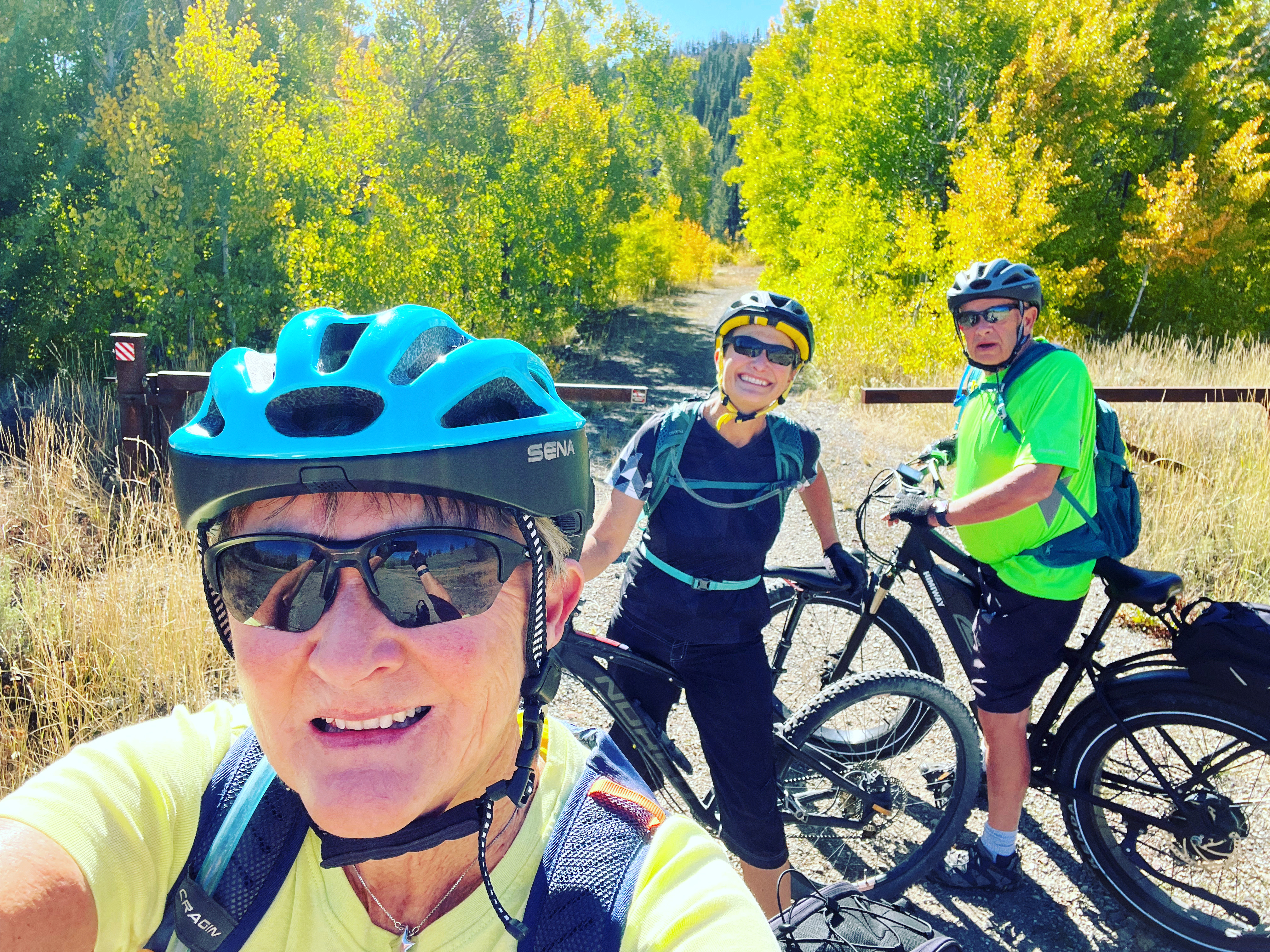 The Harriman Trail makes a long, gentle ascent north of Ketchum all the way to Galena Lodge, about 19 miles one way. My parents have a unique buddy system. Babs and Big L have bluetooth helmets so they can talk to each other. My dad has impaired vision and my mom rides in front of him and describes the topography and other notable conditions he may want to consider while operating a motorized vehicle/e-bike.